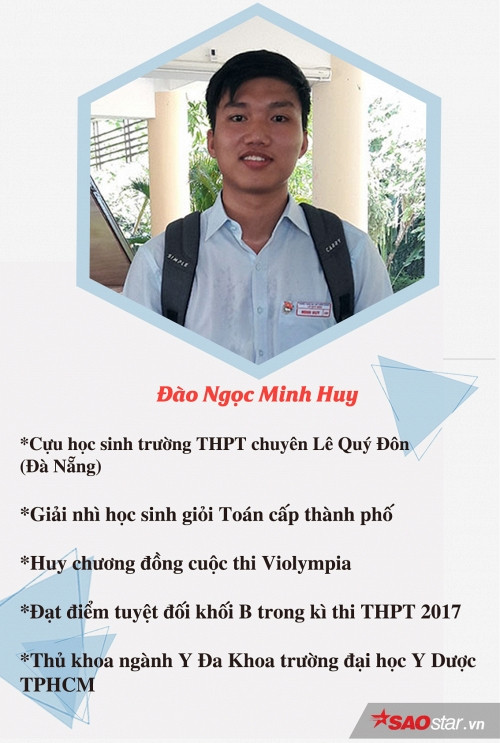 Huy là học sinh trường THPT chuyên Lê Quý Đôn (Đà Nẵng), anh bạn này từng chinh chiến qua nhiều cuộc thi và rinh về nhiều giải thưởng như Giải nhì học sinh giỏi Toán cấp thành, Huy chương đồng Violympic,… Ngoài ra cậu còn có điểm thi khá đáng nể, ngoài tuyệt đối khối B ra, thì Huy còn đạt 29 điểm khối A và 28,6 điểm khối A1.