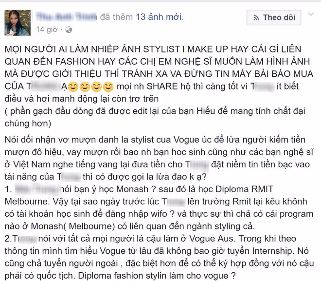 "Người Việt mình bên này rất ít người theo ngành này, lại nghe B.T bảo làm cho Vogue nên tin tưởng thuê làm chung rồi cuối cùng tiền mất tật mang. Làm việc chung không hài lòng B.T mang lên mạng chửi bới. Mình quyết định bóc phốt cho mọi người thấy bộ mặt thật của B.T vì trong quá trình mình và B.T tham gia các dự án đã nảy sinh rất nhiêu vẫn đề từ việc nói dối của bạn ấy. Mình và các bạn khác đều bị dính chưởng", T. bức xúc nói.