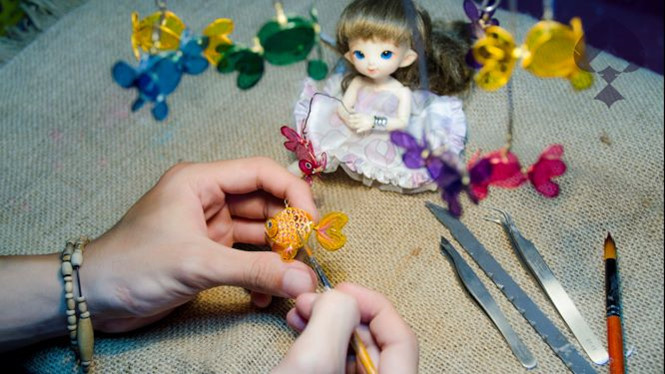 24 tuổi, nhưng tính về số năm “chơi” với những chất liệu khác nhau tạo ra phụ kiện thì Lâm Kim Long cũng thuộc nhóm “sự phụ” với 8 năm ngồi “nghịch”, chế vật dụng linh tinh. “Mình từng chế chai nhựa, lon nhôm thành lồng đèn, làm trang sức bạc, đồng, làm búp bê…. suốt nhiều năm. Ban đầu chỉ nghĩ đó là thú vui lúc rảnh rỗi, nhưng bây giờ, chính những thứ mình không cố tính học, chỉ làm vì đam mê lại giúp mình kiếm sống. Hiện giờ mình thoải mái, hạnh phúc với công việc đang làm. Mỗi ngày ngồi “chế” ra vài món lạ lạ, để phục vụ nhu cầu của khách. Đây cũng là cách giúp mình tái đầu tư, mua nguyên liệu làm nhiều sản phẩm khác. Mình cũng có kế hoạch làm bộ sản phẩm thật độc cho mùa lễ Halloween, cũng như Noel sắp tới”, Long chia sẻ.