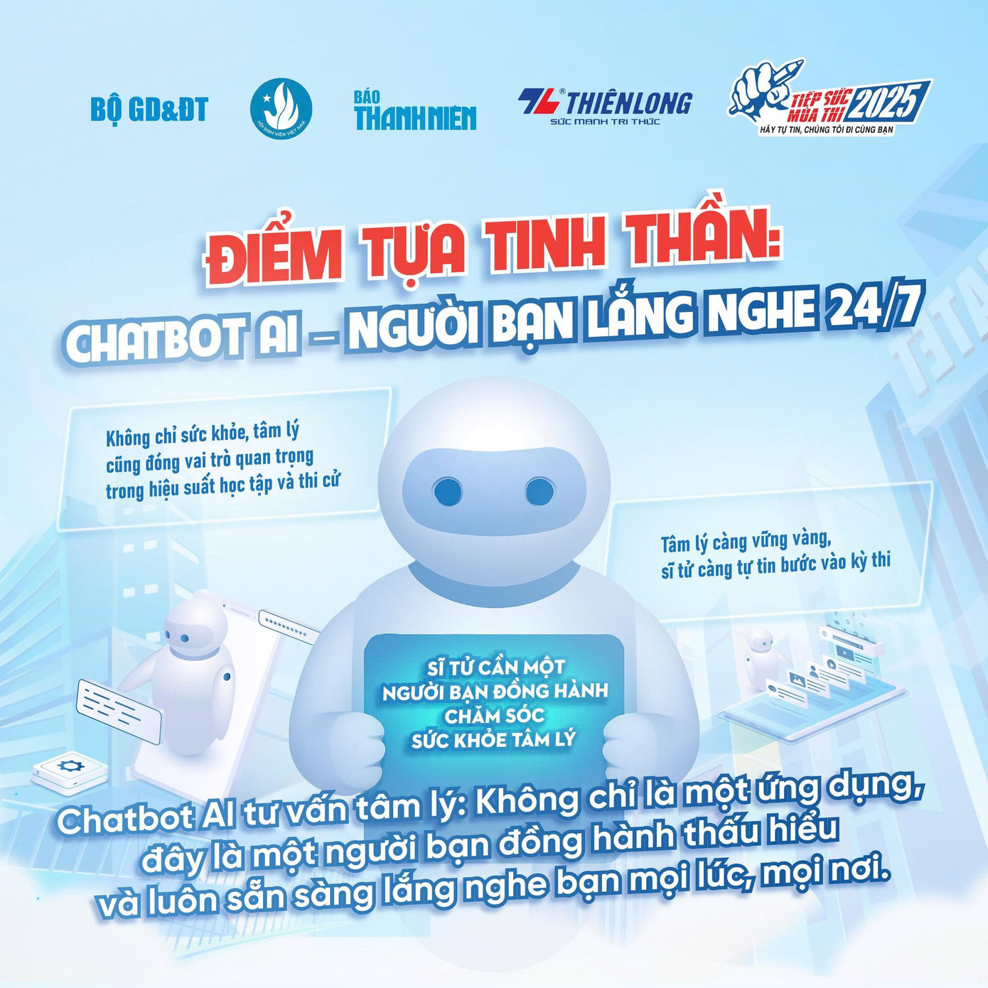 Để đồng hành cùng thí sinh trong giai đoạn này, chương trình 'Tiếp sức mùa thi' 2025 triển khai nền tảng Chatbot AI tư vấn tâm lý miễn phí, hoạt động liên tục 24/7, tại địa chỉ tiepsucmuathi.vn/tu-van-tam-ly.