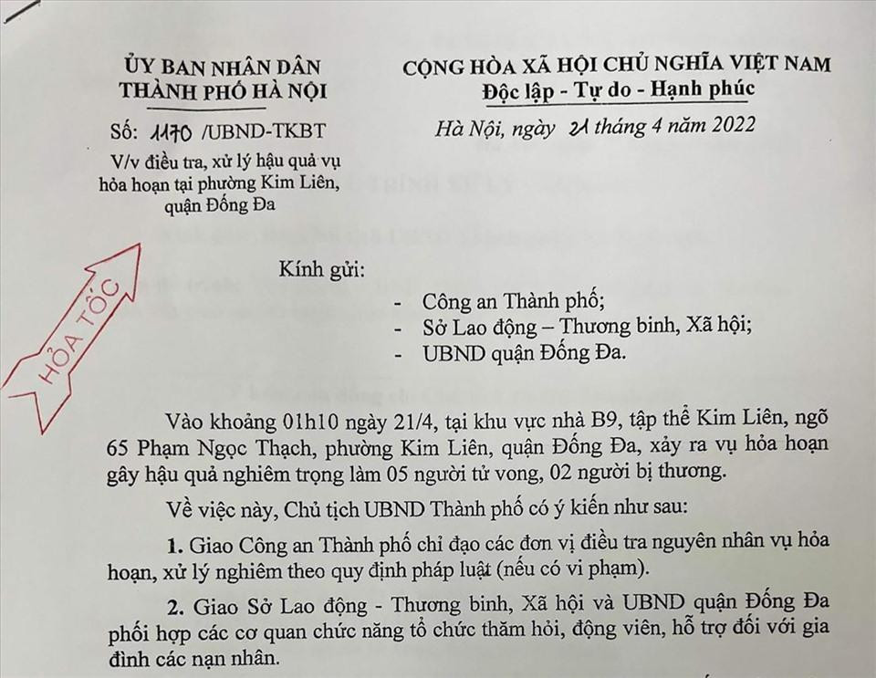 Trong văn bản hỏa tốc sáng cùng ngày, Chủ tịch UBND Hà Nội giao Công an thành phố chỉ đạo các đơn vị điều tra, xử lý nghiêm nếu có vi phạm. Sở Lao động, Thương binh và Xã hội cùng UBND quận Đống Đa phối hợp cơ quan chức năng tổ chức thăm hỏi, động viên, hỗ trợ gia đình nạn nhân. Kết quả thực hiện các công việc này phải được báo cáo về Thành ủy, UBND thành phố trước ngày 25/4.