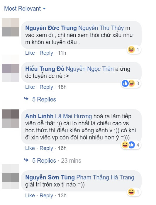 Trong rất nhiều bình luận, nổi bật nhất có lẽ chính là câu trả lời của trang Tiếp Viên Hàng Không. Khi được đặt câu hỏi hãng có nhận nhân viên part-time hay không vì bạn đủ hết tiêu chuẩn, tuy nhiên vẫn còn đang học đại học, page đã trả lời: "Em nên học xong rồi thi nhé." Một chín một mười như thế này, bài đăng tuyển tiếp viên hàng không này chắc là một trong những thông tin tuyển dụng "khó đỡ" nhất ngành hàng không từ trước đến nay.