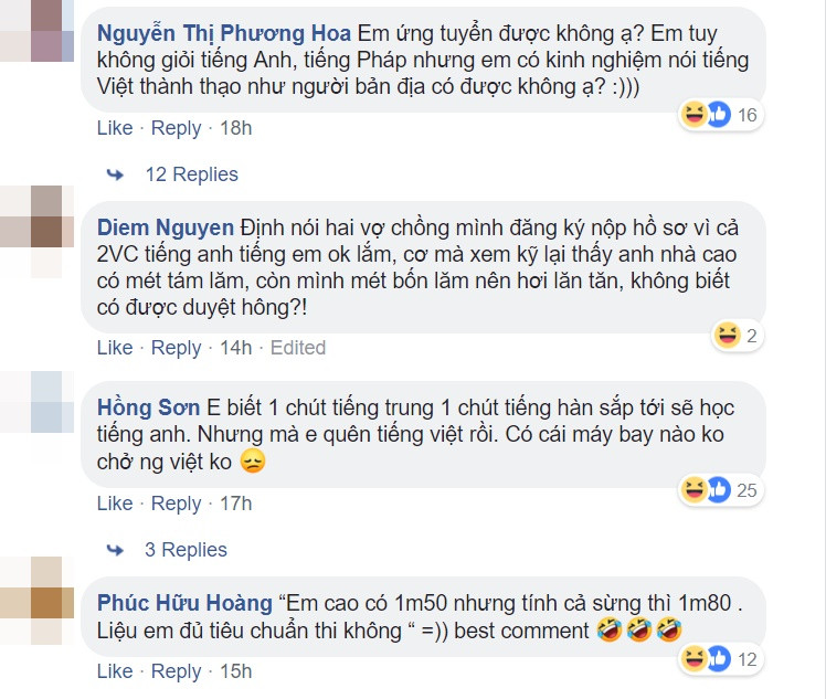 Ngoài những tiêu chí trên, ứng viên còn phải bắt buộc đạt đúng trình độ về tiếng Anh mà hãng hàng không này yêu cầu. Từ những thông tuyển dụng đó, ngay lập tức đã xuất hiện các bình luận của động đồng mạng. Phần lớn đều là những câu hỏi "ngây ngô" mà không ai có thể "đỡ nổi".