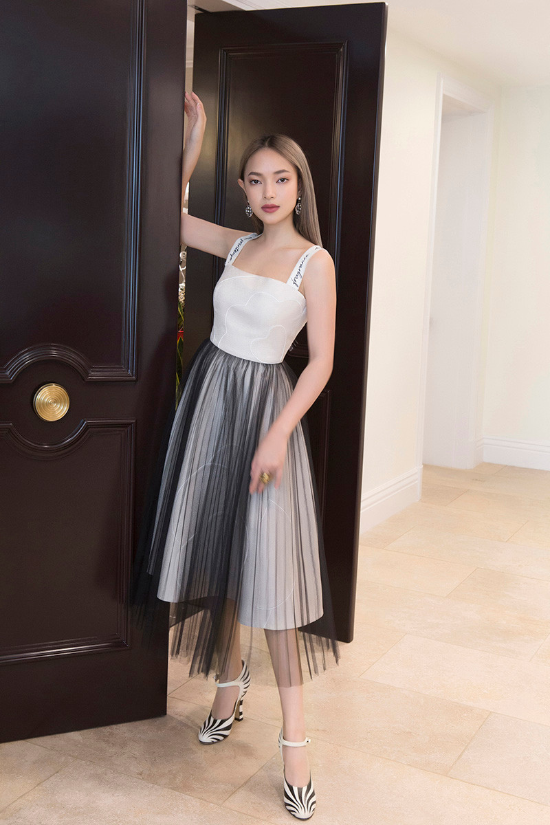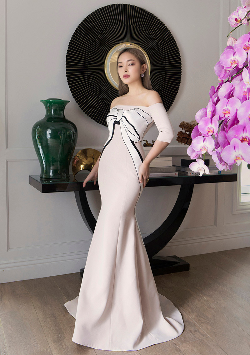 Vẫn là những thiết kế quen thuộc như đầm cúp ngực, đầm đuôi cá, nhấn nhá bằng chi tiết đắp vải tạo hoạ tiết chiếc nơ to bản dọc thân váy, hay tấm khăn choàng hờ hững bằng voan kính đính kết chi tiết ren hoa 3D, Châu Bùi lột xác thành một quý cô thanh lịch, sang trọng và cuốn hút người đối diện bằng thần thái lạnh lùng đầy bí ẩn.