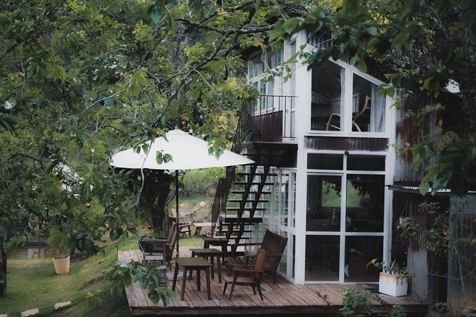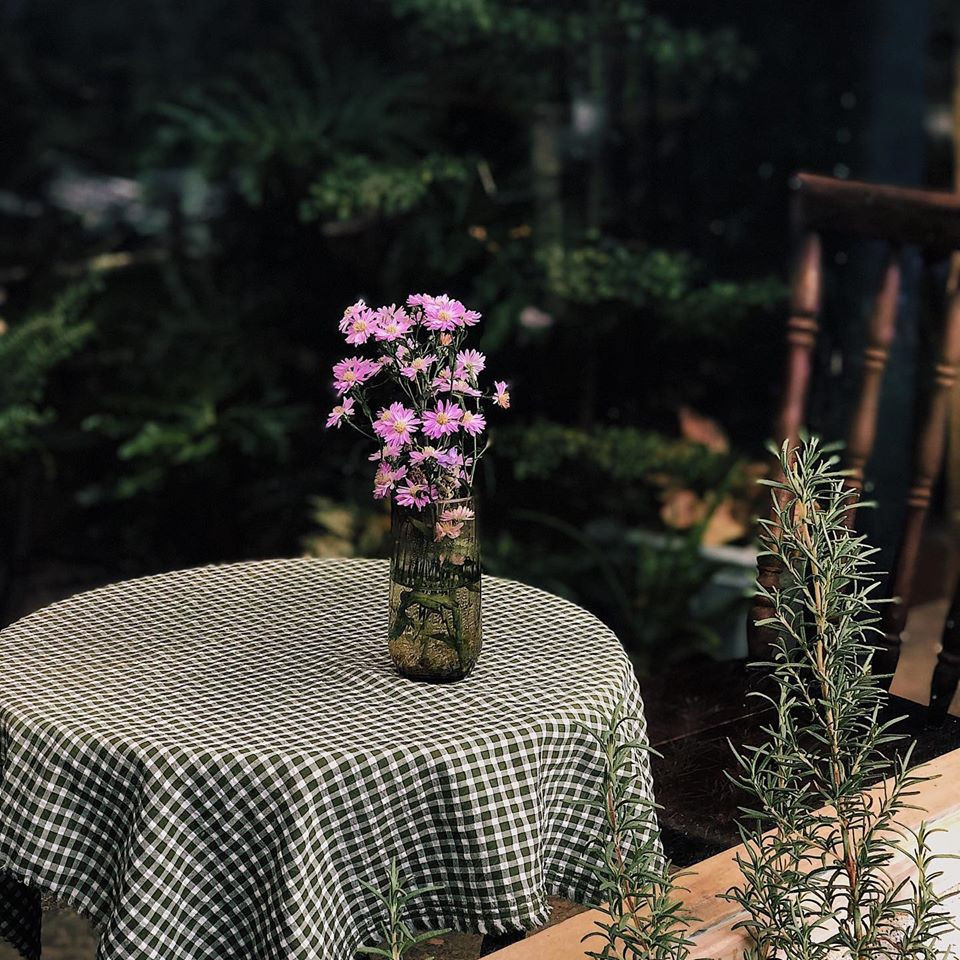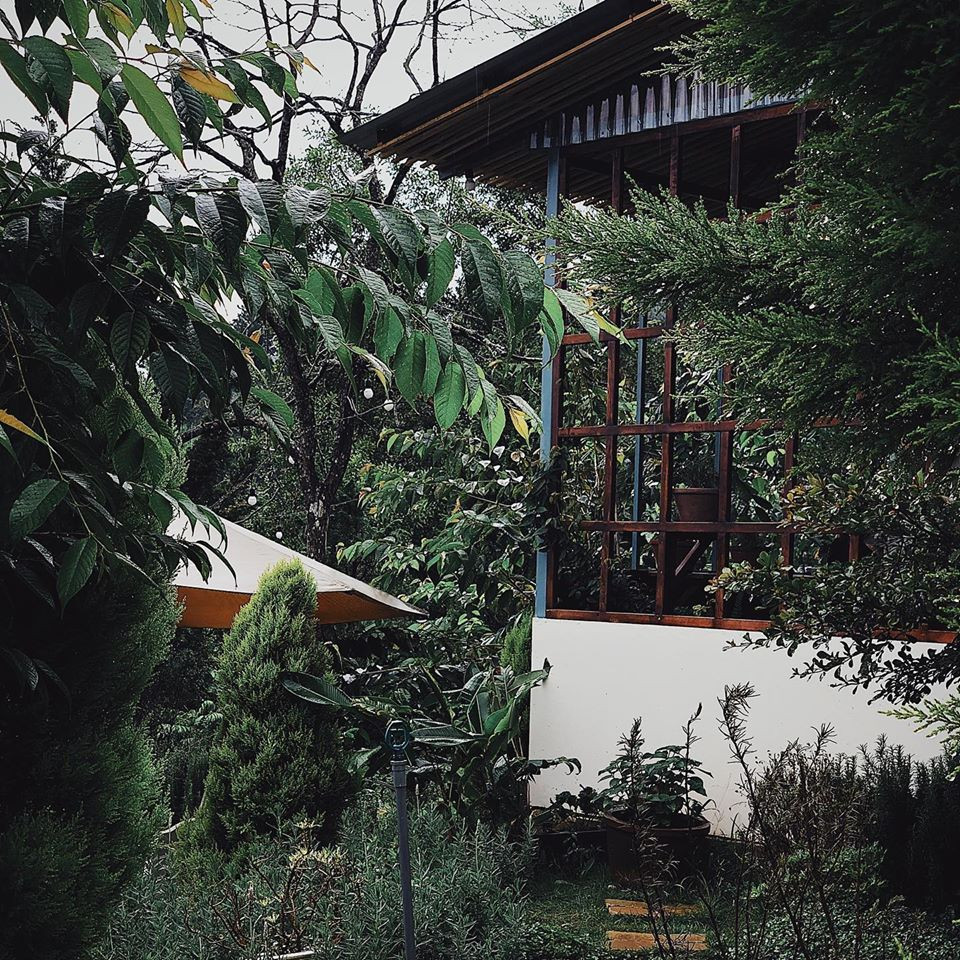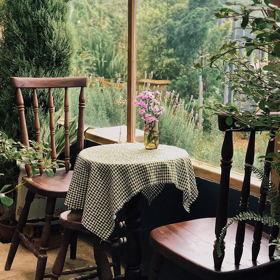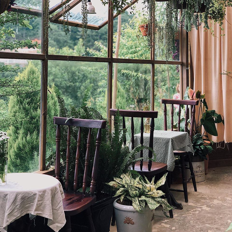 Từ lối vào với chiếc cổng mộc mạc phủ đầy hoa râm bụt, đến những mảng xanh mướt mắt từ hoa cỏ hai bên lối đi. Và gian nhà chính nằm lọt thỏm trong không gian xanh (lại xanh) quyến rũ khác len lỏi đến từng góc bàn, những background sống ảo đẹp quên sầu mà chỉ cần giơ máy là bạn có ngay vài tấm hình đẹp.