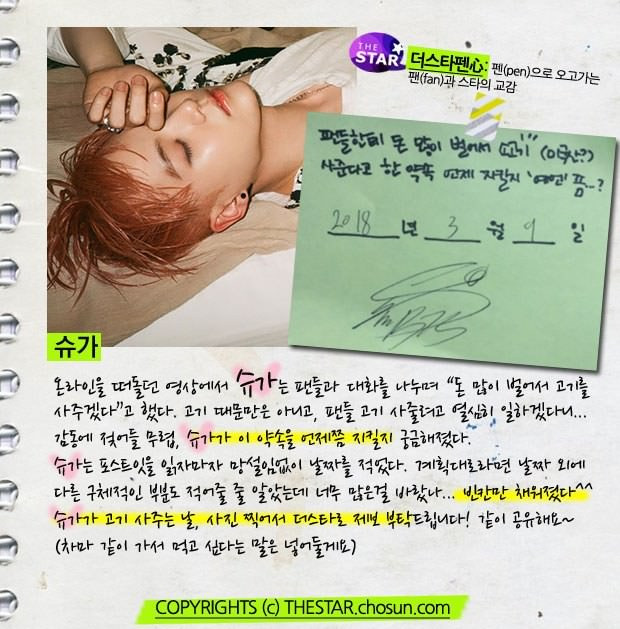 Chuyện là trong một fansign diễn ra từ tháng 9/2014, Suga có hứa với các fan rằng khi nào anh chàng thành công và kiếm được nhiều tiền, Suga sẽ mua thịt nướng mời mọi người ăn, vì biết các A.R.M.Y đều rất thích ăn thịt bò.