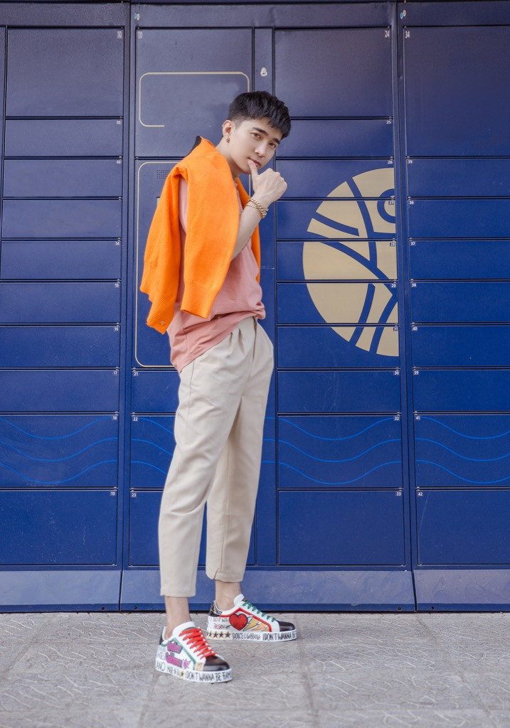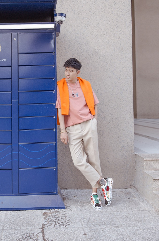 Cách “chơi màu” trong set đồ tiếp theo này của Chi Dân cũng hay ho không kém khi anh kết hợp chiếc basic tee sắc hồng pastel cùng chiếc quần kaki màu beige. Nam ca sĩ nhấn nhá thêm chiếc sweatshirt tông cam nổi bật để tạo nên tổng thể hoà hợp với đôi sneaker bên dưới.