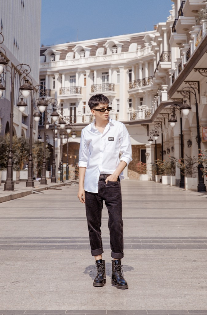 Vốn dĩ áo sơ mi trắng thường là một bộ đôi ăn ý với quần kaki hoặc quần tây nhưng nam ca sĩ lại tạo nên một nguồn cảm hứng mới với chiếc quần chất nhung tăm khá “bụi bặm”. Bên cạnh đó kết hợp đôi boots càng dễ dàng tạo nên tổng thể cá tính cho Chi Dân dù vẫn chỉ diện 2 gam màu đen - trắng đơn sắc.