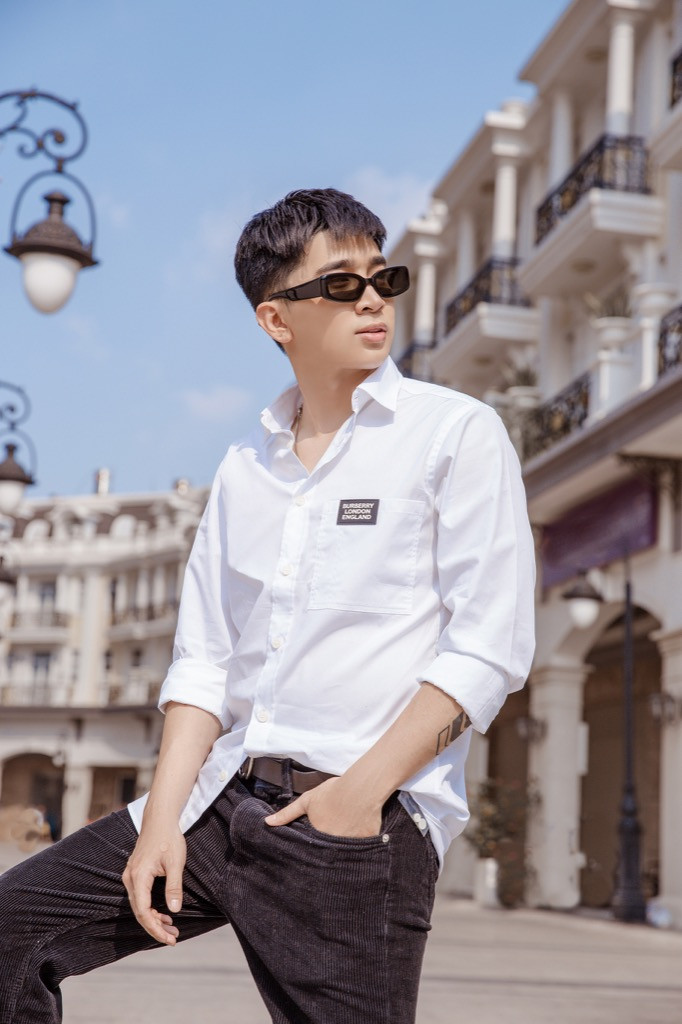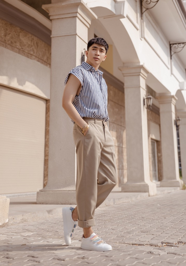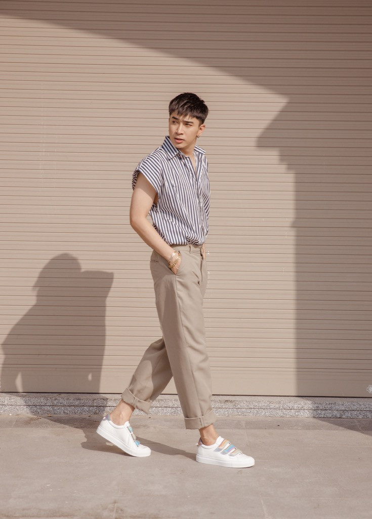 Đây có lẽ là một màn “mách nước” cực hay ho cho cánh mày râu để trở thành tâm điểm khi xuống phố những ngày hè mà vẫn mát mẻ, lại dễ gây “say nắng” hội chị em. Chi Dân khá nhạy trọng khoản chọn màu sắc cộng hưởng khi chọn chiếc áo sơ mi họa tiết striped gam trắng xanh, kết hợp chiếc quần xắn gấu tông beige và đôi sneaker năng động.