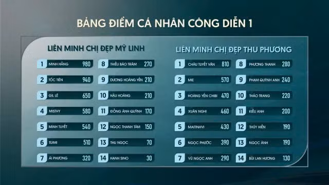 Kết thúc đêm Công diễn 1, Liên minh của Chị Đẹp Mỹ Linh giành chiến thắng với tổng điểm hoa sóng của 14 thành viên đạt 8490 điểm. Trong khi đó, Liên minh của Chị Đẹp Thu Phương chỉ đạt 8290 bình chọn của khán giả. Theo luật của chương trình, Liên minh Thu Phương sẽ phải nói lời tạm biệt 2 thành viên có điểm hoa sóng thấp nhất (Chị Đẹp Ngọc Ánh và Bùi Lan Hương).