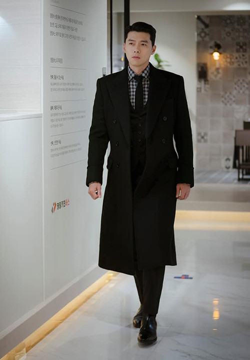 Với chiều cao 1m85 và thân hình đẹp như tượng tạc, Hyun Bin không chỉ chinh phục các bộ vest lịch lãm mà còn cân được cả áo khoác dáng dài như thế này. Nhiều fan girl đã xuýt xoa khen ngợi đại úy Ri Jung Hyuk giờ chẳng khác gì tổng tài và cực đẹp đôi bên chị đại Yoon Se Ri.