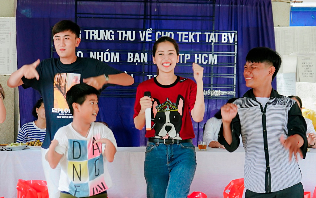 Tại đây, ngoài việc trao những phần quà, Chi Pu và Á hậu Thuỳ Dung còn dành nhiều thời gian giao lưu, trò chuyện với các em nhỏ, phụ huynh và nhân viên ở làng Hoà Bình. Sự thân thiện, gần gũi của hai người đẹp cũng khiến không khí buổi thiện nguyện thêm phần vui vẻ, xoá tan khoảng cách xa lạ. Không những vậy, để góp vui, Chi Pu còn hào hứng hát và nhảy ca khúc Đoá hoa hồng cùng các em nhỏ khuyết tật.