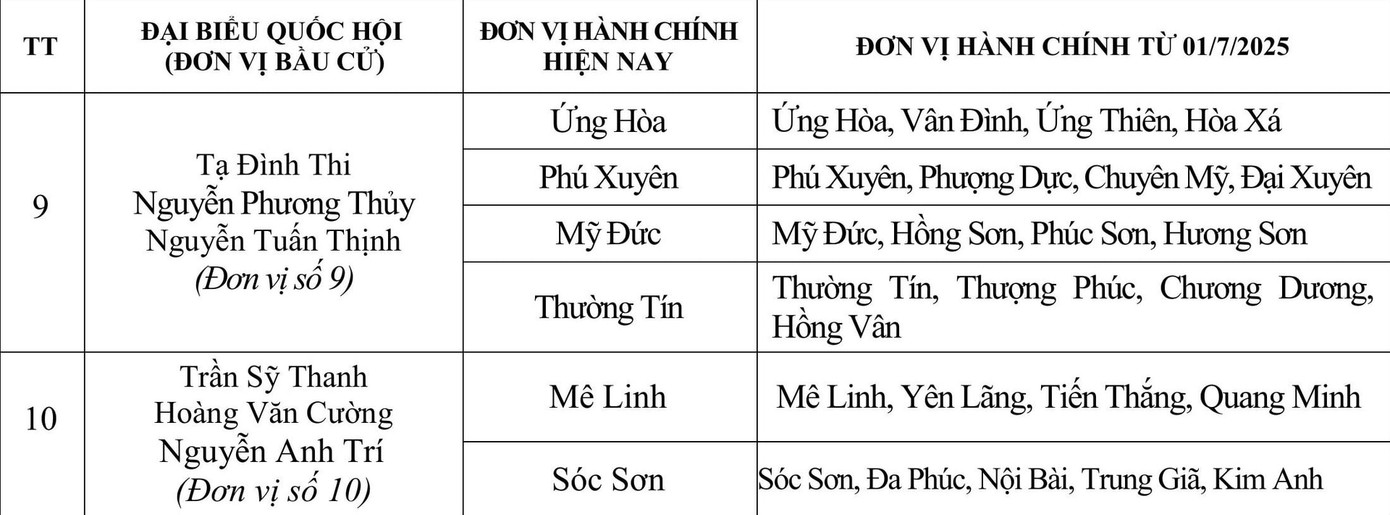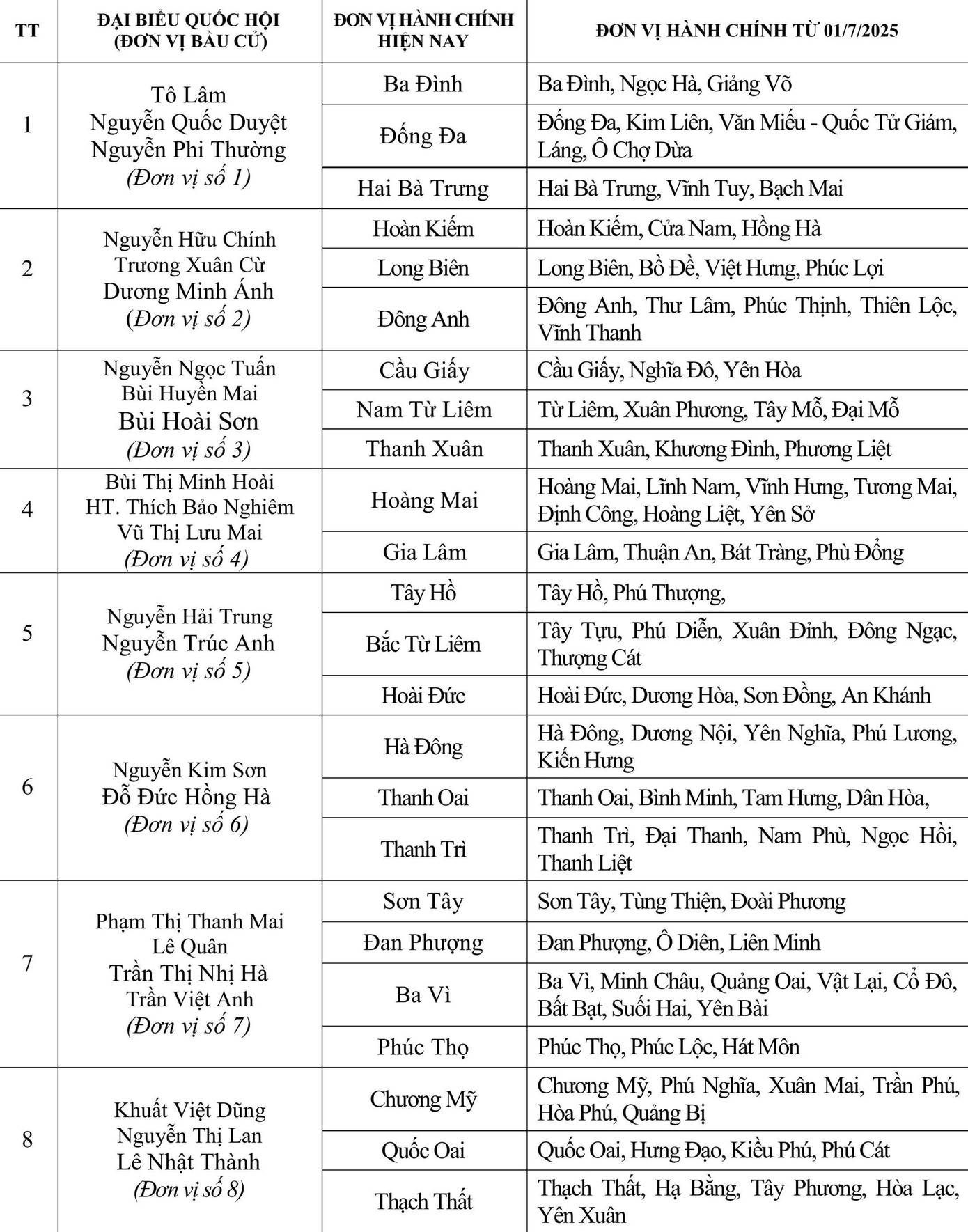 Theo đó, Đơn vị bầu cử số 1 sẽ gồm các phường: Ba Đình, Ngọc Hà, Giảng Võ, Đống Đa, Kim Liên, Văn Miếu - Quốc Tử Giám, Láng, Ô Chợ Dừa, Hai Bà Trưng, Vĩnh Tuy, Bạch Mai. Các đại biểu Quốc hội thuộc Đơn vị bầu cử số 1, gồm: Tổng Bí thư Tô Lâm, Trung tướng Nguyễn Quốc Duyệt - Tư lệnh Bộ Tư lệnh Thủ đô và Giám đốc Sở Xây dựng Hà Nội Nguyễn Phi Thường.