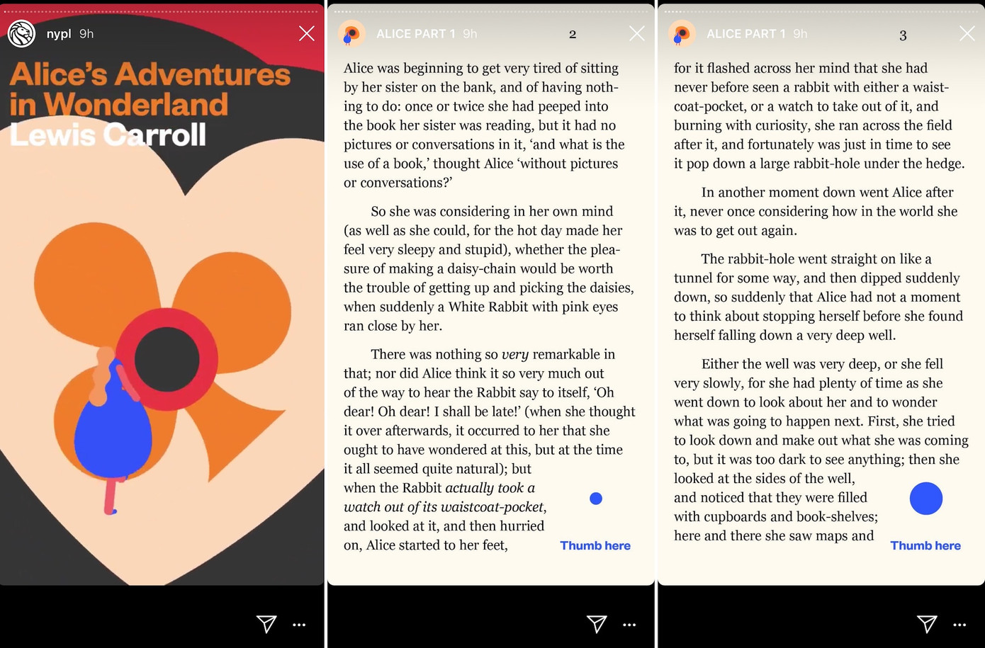Đại diện NYPL cho biết: "Sự hấp dẫn chính của Insta Novels đến từ việc dễ đọc. Tính năng Insta Story hỗ trợ các đọc các trang dài 15 giây. Nhưng nếu bạn không đủ thời gian để đọc xong một trang, bạn có thể giữ ngón tay trên màn hình cho đến khi bạn hoàn tất. Thậm chí, chúng tôi còn thiết kế một nút thuận tiện ở góc phải phía dưới, giúp bạn có thể nhấn mà không che các phần của văn bản".