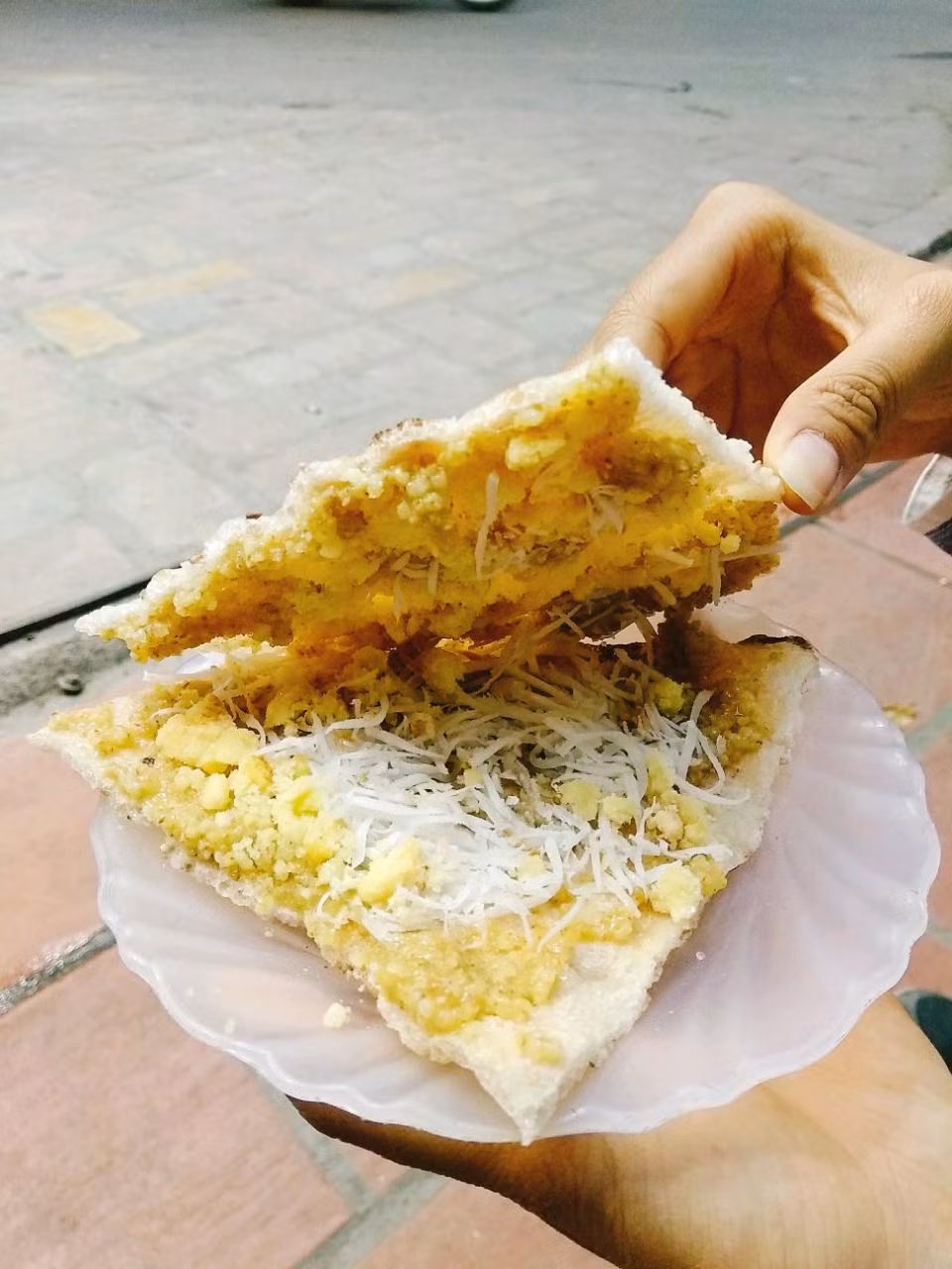 Món bánh này mới xuất hiện nhưng đã được các tín đồ sành ăn săn lùng, bởi chỉ mới nghe cái tên thôi đã đầy gọi mời: Bánh tam giác sốt bò. Miếng bánh đa được bẻ thành hình tam giác và rắc thêm bột thơm. Tổng thể chiếc bánh có màu vàng nâu nhìn đẹp mắt.