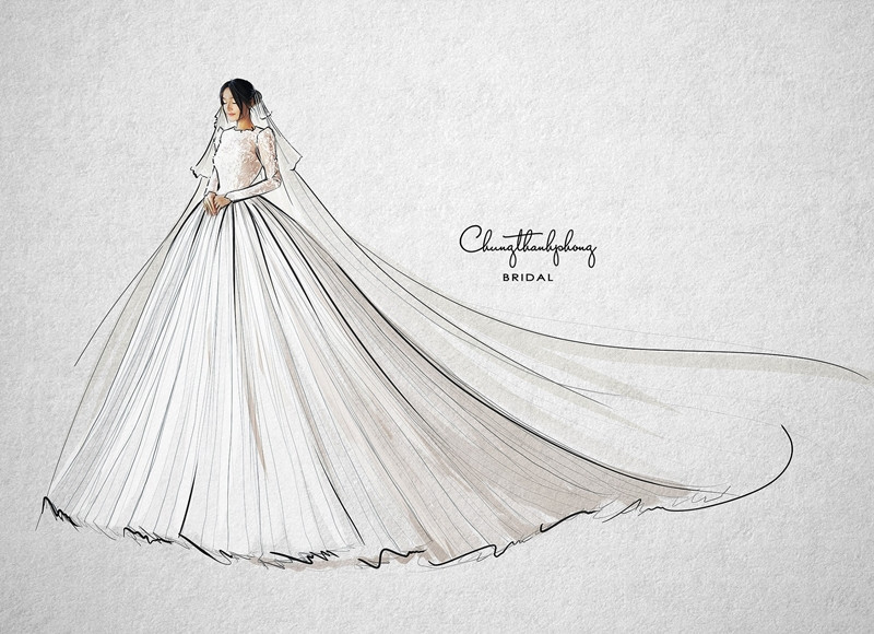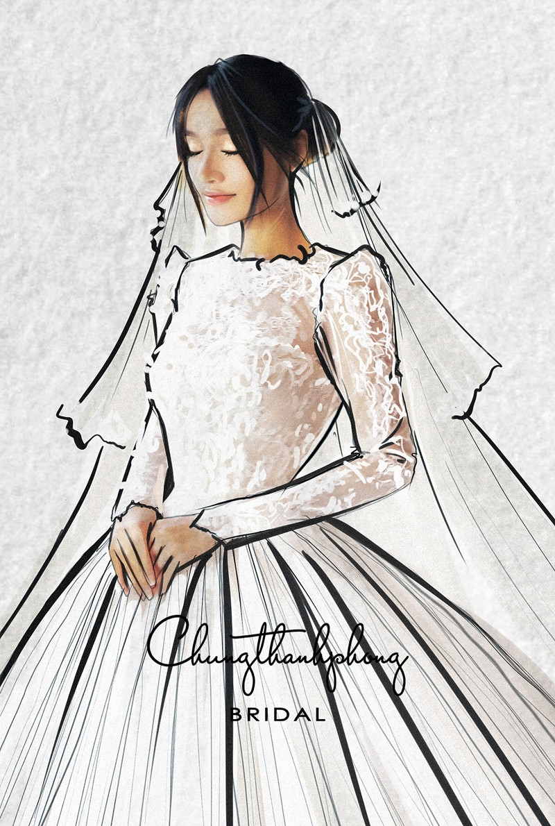 Nếu để ý kĩ chiếc váy cưới, có thể thấy Chung Thanh Phong gần như không sử dụng bất kì loại pha lê đính kết nào, hoàn toàn nhấn vào chất liệu vải ren và lưới cao cấp đặc trưng của trang phục cưới. Thay vào đó, anh chú trọng vào cách xử lý vải, kỹ thuật may và dựng phom dáng, sao cho bộ cánh cuối cùng toát lên vẻ thanh lịch, nền nã. Chia sẻ về thời gian hoàn thành chiếc váy này, anh cho biết bản thân và ekip đã phải làm việc miệt mài suốt 1 tháng, tuy bộ cánh mang phong cách tối giản nhưng thực hiện thì không hề đơn giản chút nào vì từng chi tiết đều được tính toán, sắp xếp 1 cách tỉ mỉ, chỉn chu.