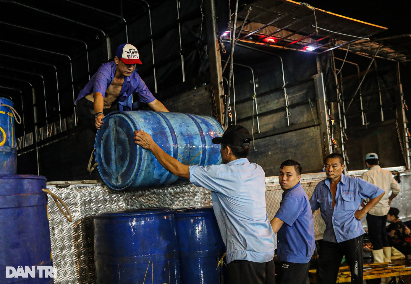Lượng lớn đá lạnh được vận chuyển tới các vựa cá để ngâm và rửa cá trước khi chế biến theo một số đơn hàng của thương lái.
