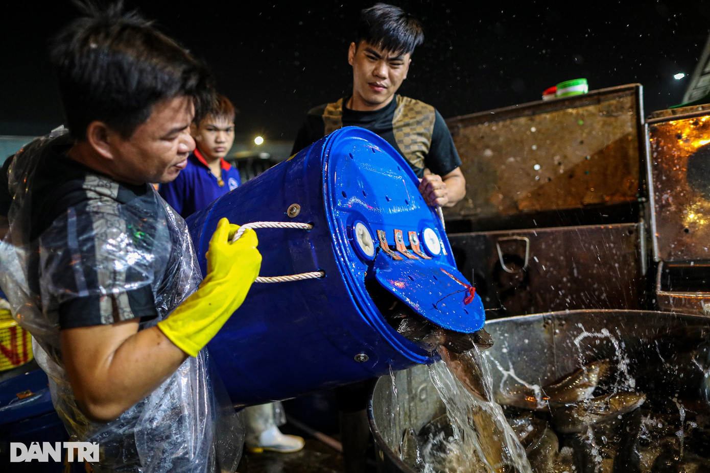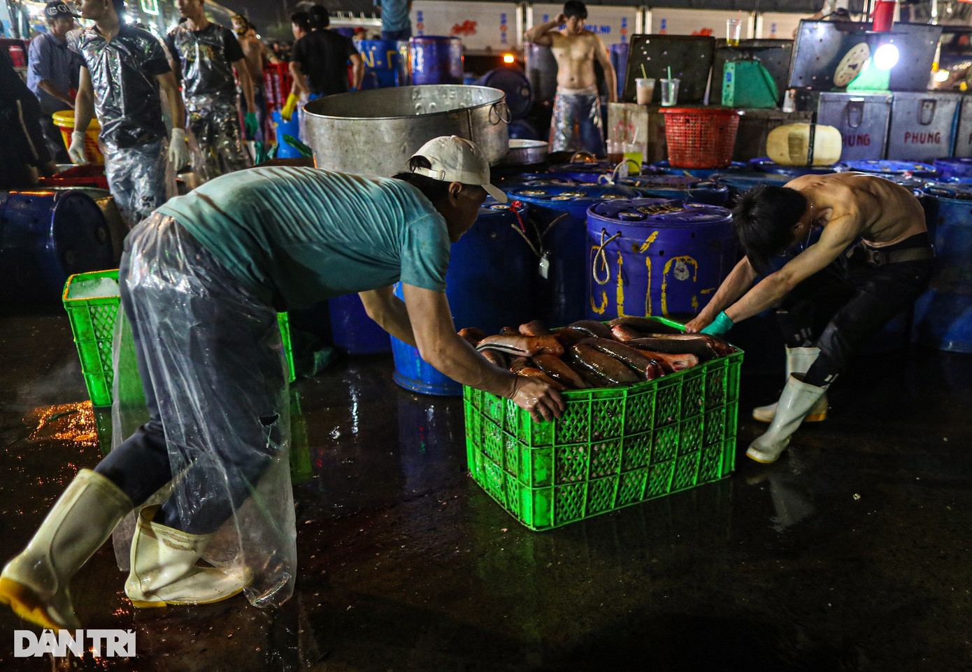 Cá sau khi đưa vào các vựa, sẽ được cho ra bể chứa lớn để phân loại. Công việc này cần dùng sức và sự linh hoạt nên đa số nhân công tại các vựa cá đều là nam giới.