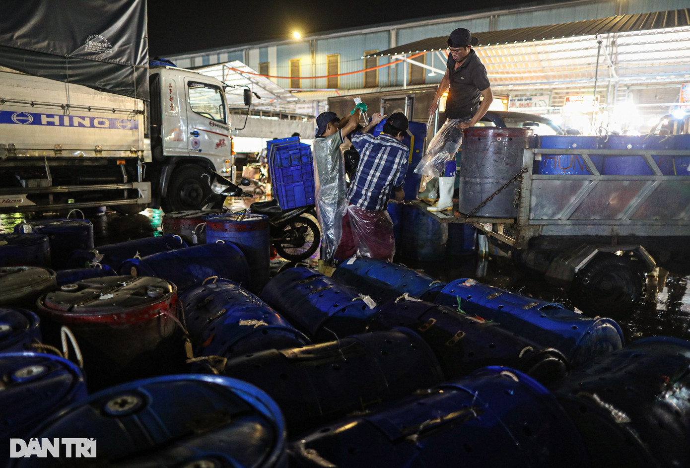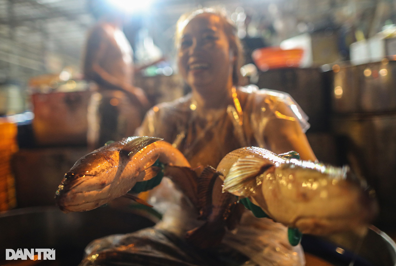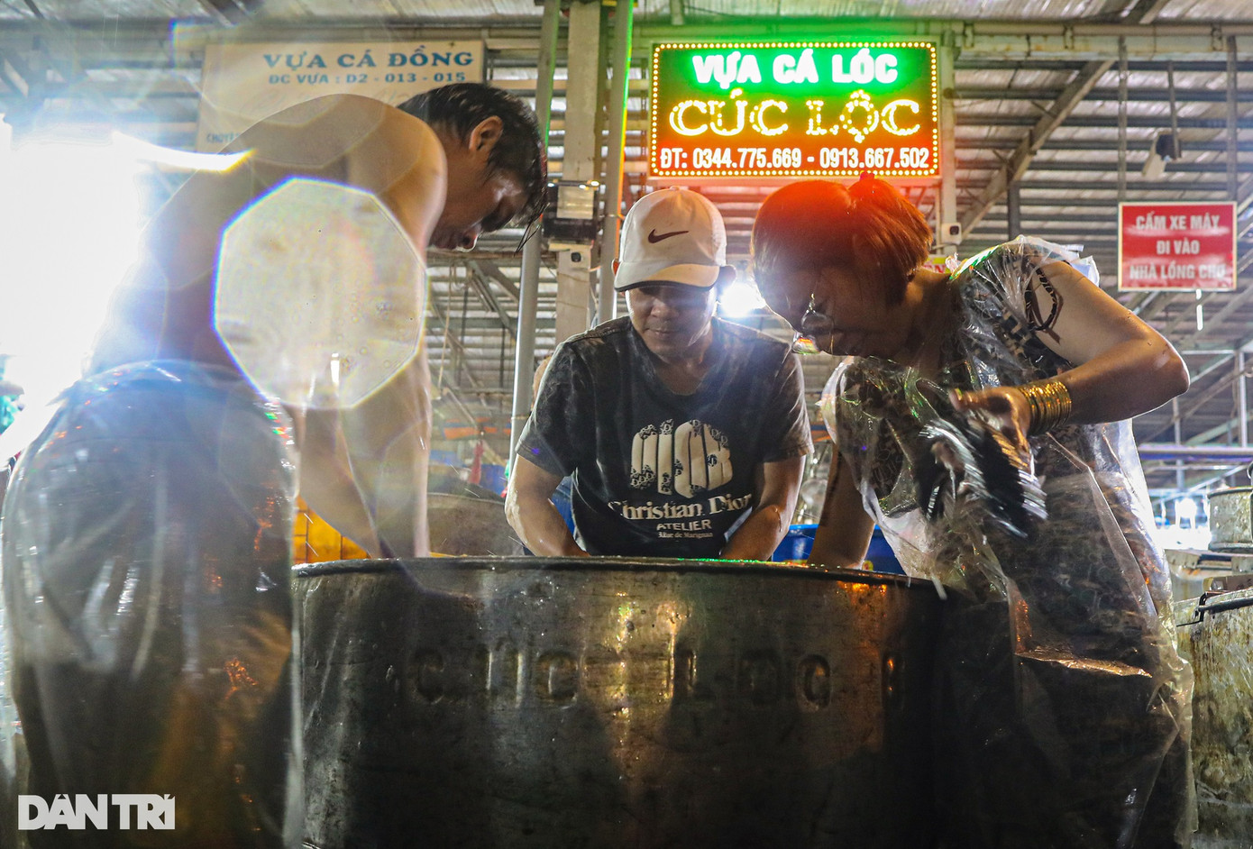 Có mặt ở chợ Bình Điền lúc 2h sáng, đây là chợ đầu mối thu gom cá lóc lớn nhất TPHCM mỗi khi tới dịp vía Thần Tài. Khu vực các vựa cá lóc có hàng trăm người đang tất bật xuống hàng, vận chuyển, phân loại cá để sẵn sàng cho các thương lái tới mua.
