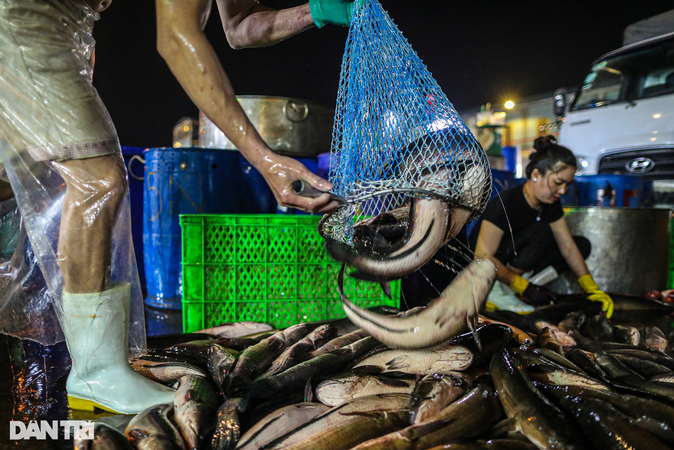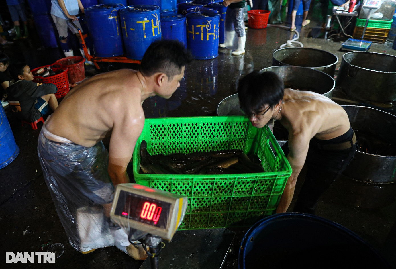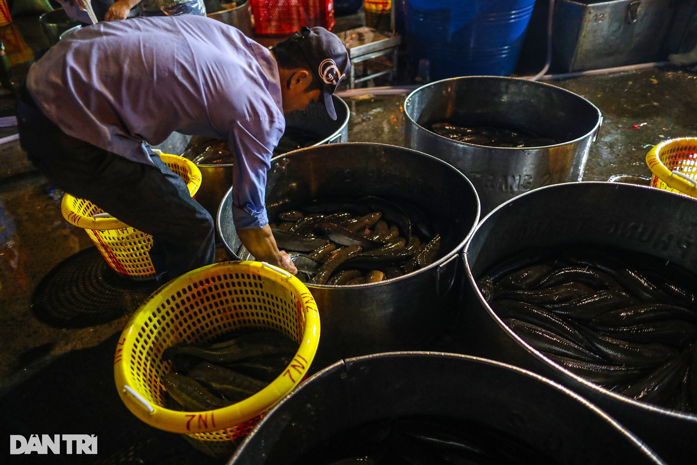 Có mặt ở chợ Bình Điền lúc 2h sáng, đây là chợ đầu mối thu gom cá lóc lớn nhất TPHCM mỗi khi tới dịp vía Thần Tài. Khu vực các vựa cá lóc có hàng trăm người đang tất bật xuống hàng, vận chuyển, phân loại cá để sẵn sàng cho các thương lái tới mua.