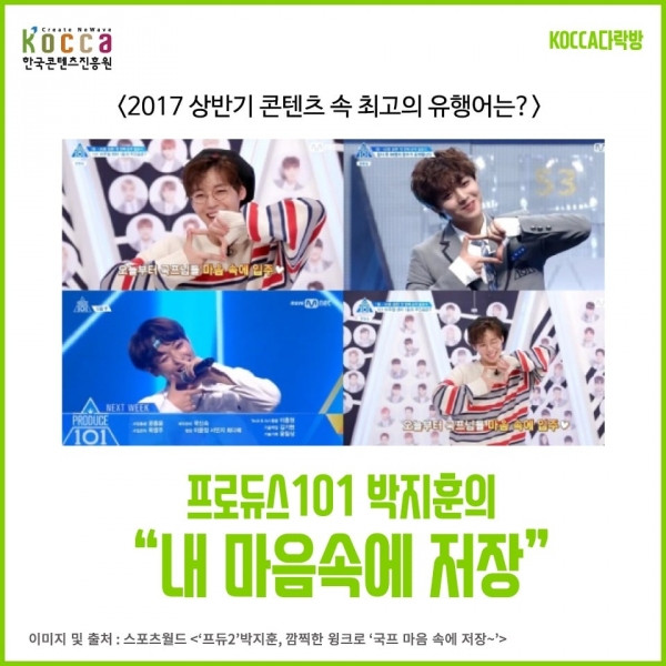 Mới đây, Sở Sáng tạo Nội dung Hàn Quốc (KOCCA) đã công bố câu khẩu hiệu phổ biến nhất nửa đầu năm 2017. Và “Nae maeum soge jeo jang” (Tôi sẽ lưu bạn trong trái tim mình" - một cụm từ được tạo ra và phổ biến bởi Park Ji Hoon (Wanna One) trong những ngày anh chàng tham gia Produce 101, đã được vinh danh.