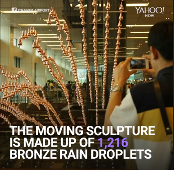 Tác phẩm điêu khắc có tên "Mưa Kinetic" tại Terminal 1 là một trong những bộ sưu tập nghệ thuật sắp đặt và trình biễn làm mê hoặc mọi du khách khi đến sân bay Changi. Bạn sẽ được chiêm ngưỡng màn trình diễn của 1.216 giọt mưa màu đồng biến hóa thành 16 hình khối nghệ thuật khác nhau, kích thước của mỗi tác phẩm lên tới 9,8m x 4m .