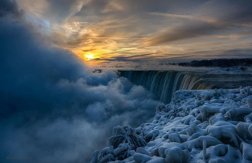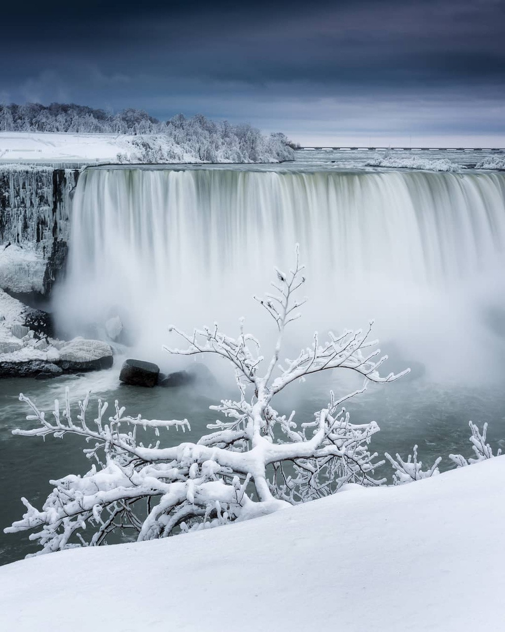 Nằm ở biên giới Mỹ và Canada, Niagara là một trong những thác nước nổi tiếng nhất thế giới. Thời điểm này hàng năm, cảnh vật xung quanh thác biến hóa, trở thành xứ sở mùa đông lạ kỳ. Nước đóng băng và sương mù biến các cột đèn, lan can và cây cối thành tác phẩm điêu khắc băng.