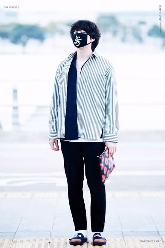 Hee Chul hẳn phải sắm cả một bộ sưu tập dép lê kèm tất đủ màu để thay đổi mỗi lần ra sân bay.