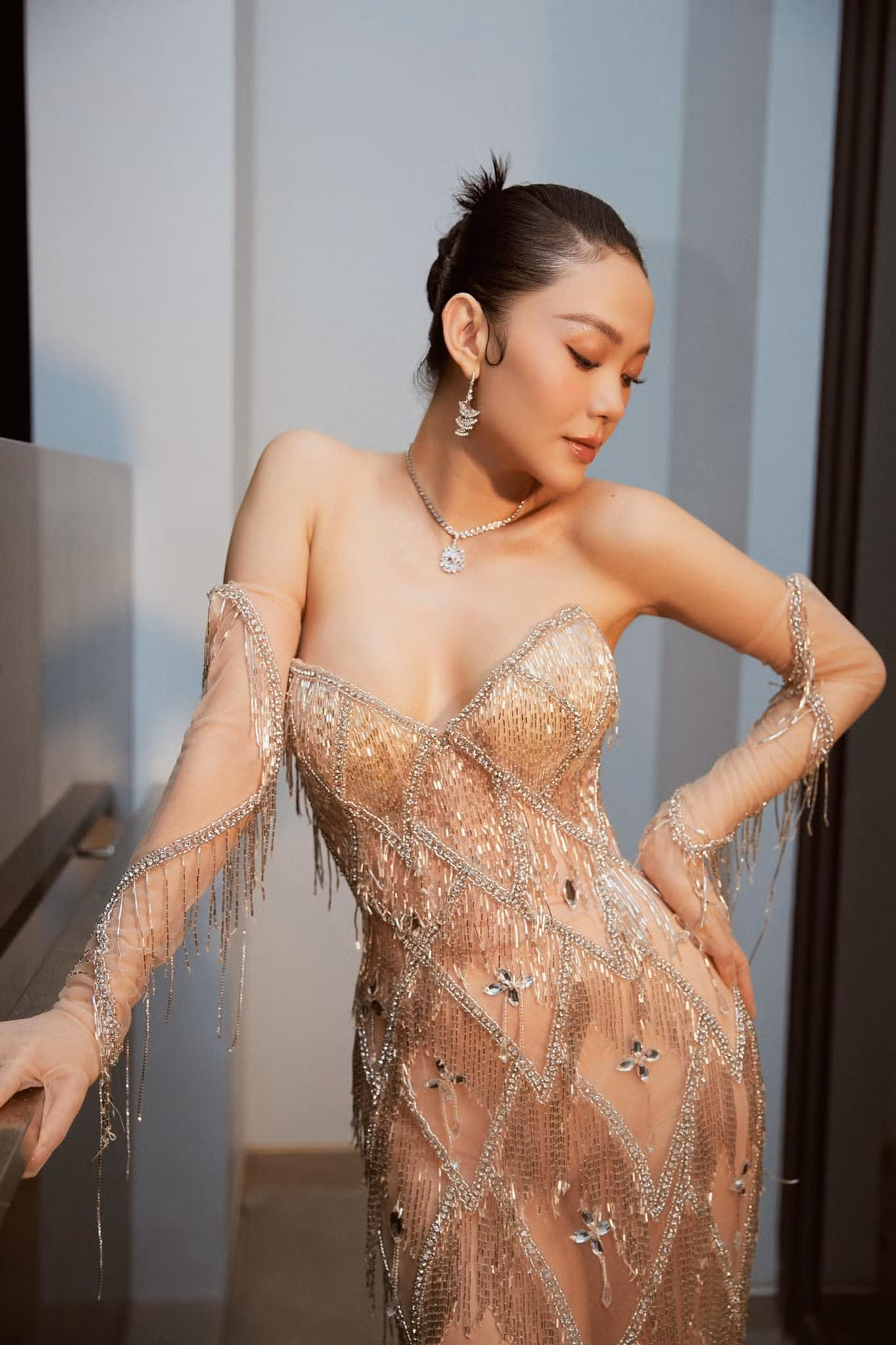 Mẫu áo độc đáo được kết từ những hạt nhựa tạo thành chuỗi bông hoa xinh xắn và Thùy Tiên đã khéo léo kết hợp với áo ôm màu nude bên trong, nhờ vậy mà nàng hậu vẫn tuyệt đối kín đáo trong thiết kế siêu xuyên thấu này.