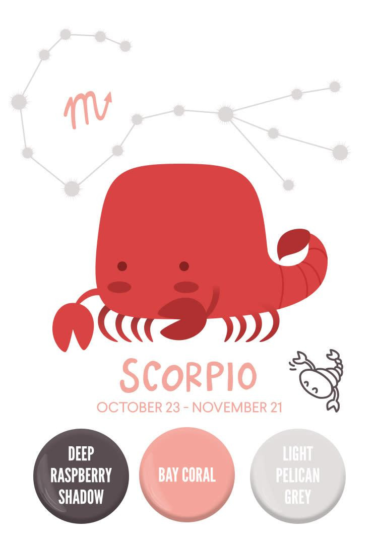 Với tính cách độc đáo và sự tò mò bẩm sinh về môi trường xung quanh, cung Bọ Cạp cần một bảng màu thể hiện niềm yêu thích phiêu lưu và giàu trí tưởng tượng. Bọ Cạp sẽ cảm thấy ấn tượng với sự kết hợp nổi bật của màu tím đậm, san hô và xám. Mới đầu, những tông màu này tạo cảm giác hơi khó "nhằn" và không thể ăn khớp nhưng với Bọ Cạp đây chính là sự kết hợp ăn ý nhất.