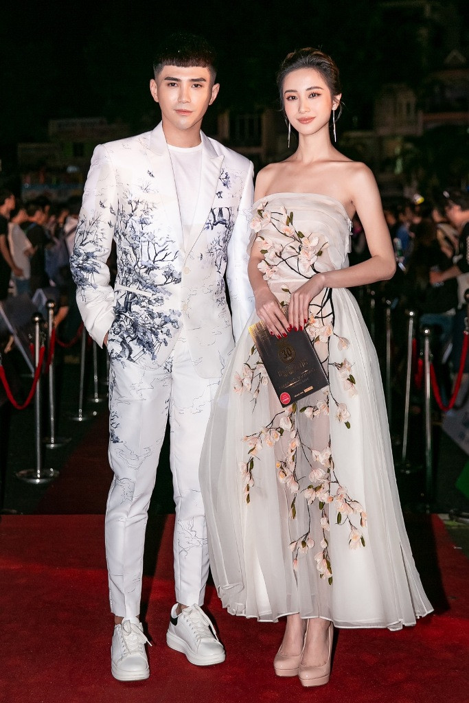 Will diện một bộ vest lịch lãm tông màu trắng với hoạ tiết "sơn thuỷ", trong khi Jun Vũ diện đầm dạ hoạ tiết cành hoa 3D của NTK Trần Hùng. Cả hai nghệ sĩ tỏ ra "ăn khớp" với set đồ lấy cảm hứng thiên nhiên ấn tượng.