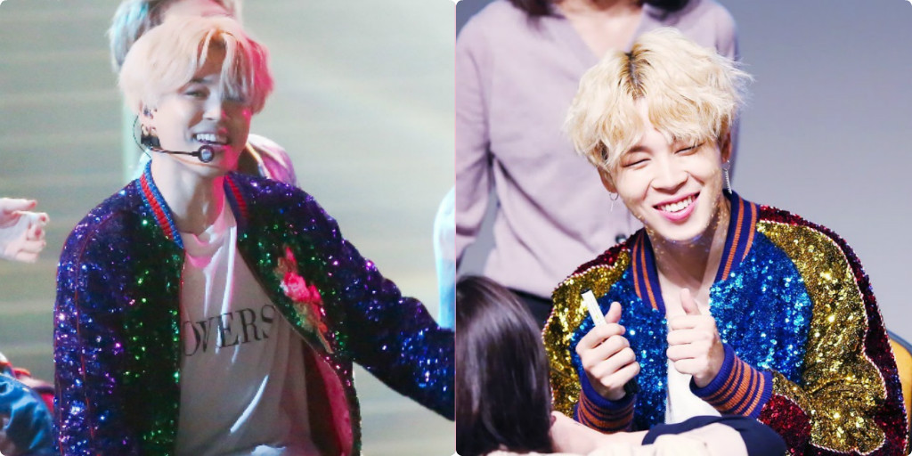 Jimin chắc chắn cực kỳ ưa thích mẫu áo bomber lấp lánh nổi bần bật của Gucci. Anh chàng có tận hai chiếc với màu sắc khác nhau. Một chiếc được Jimin khoe trong MV DNA cũng như trong các hoạt động quảng bá album Love Yourself: Her. Chiếc còn lại đã xuất hiện trên sân khấu giải thưởng AMAs 2017.