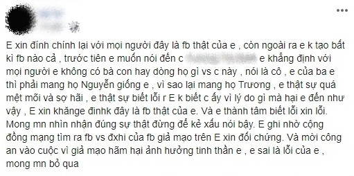 Chỉ vài tiếng sau, cô gái này tiếp tục đăng thêm một bài viết lên trang cá nhân của mình lời đính chính. Cô xác nhận rằng tất cả những Facebook khác đều không phải là mình. Thậm chí cô gái này còn chia sẻ không hề quen biết Facebook tự nhận là cô ruột của mình trước đó. Mọi thông tin người này đăng tải đều không phải là sự thật và cô cũng sẵn sàng đối chứng cũng như mời công an vào cuộc để làm rõ sự việc này.