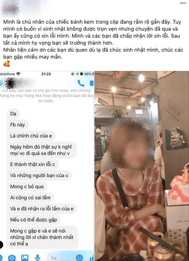 Chủ nhân chiếc bánh kem chia sẻ trên Facebook với nội dung như sau: "Mình là chủ nhân của chiếc bánh kem trong clip đang rầm rộ gần đây. Tuy mình có buồn vì sinh nhật không được trọn vẹn nhưng chuyện đã qua và bạn ấy cũng có xin lỗi mình. Mình và các bạn đã chấp nhận lời xin lỗi. Sau tất cả mình hy vọng bạn sẽ trưởng thành hơn" - cô gái chủ nhân chiếc bánh kem chia sẻ trên trang cá nhân.