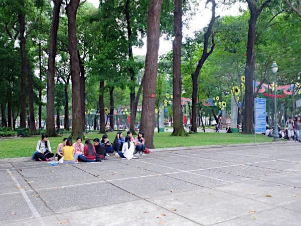 Các bạn học sinh, sinh viên chưa có điều kiện về quê hay đi du lịch trong dịp lễ chọn cách tụ tập và hàn huyên tâm sự tại các công viên trung tâm. (Ảnh: Thủy Tiên)