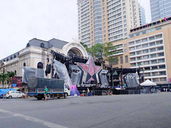 Khu vực quảng trường trước Nhà hát Thành Phố đang "chạy đua" với thời gian để kịp hoàn thành trước thời khắc đếm ngược tối nay. (Ảnh: Thủy Tiên)