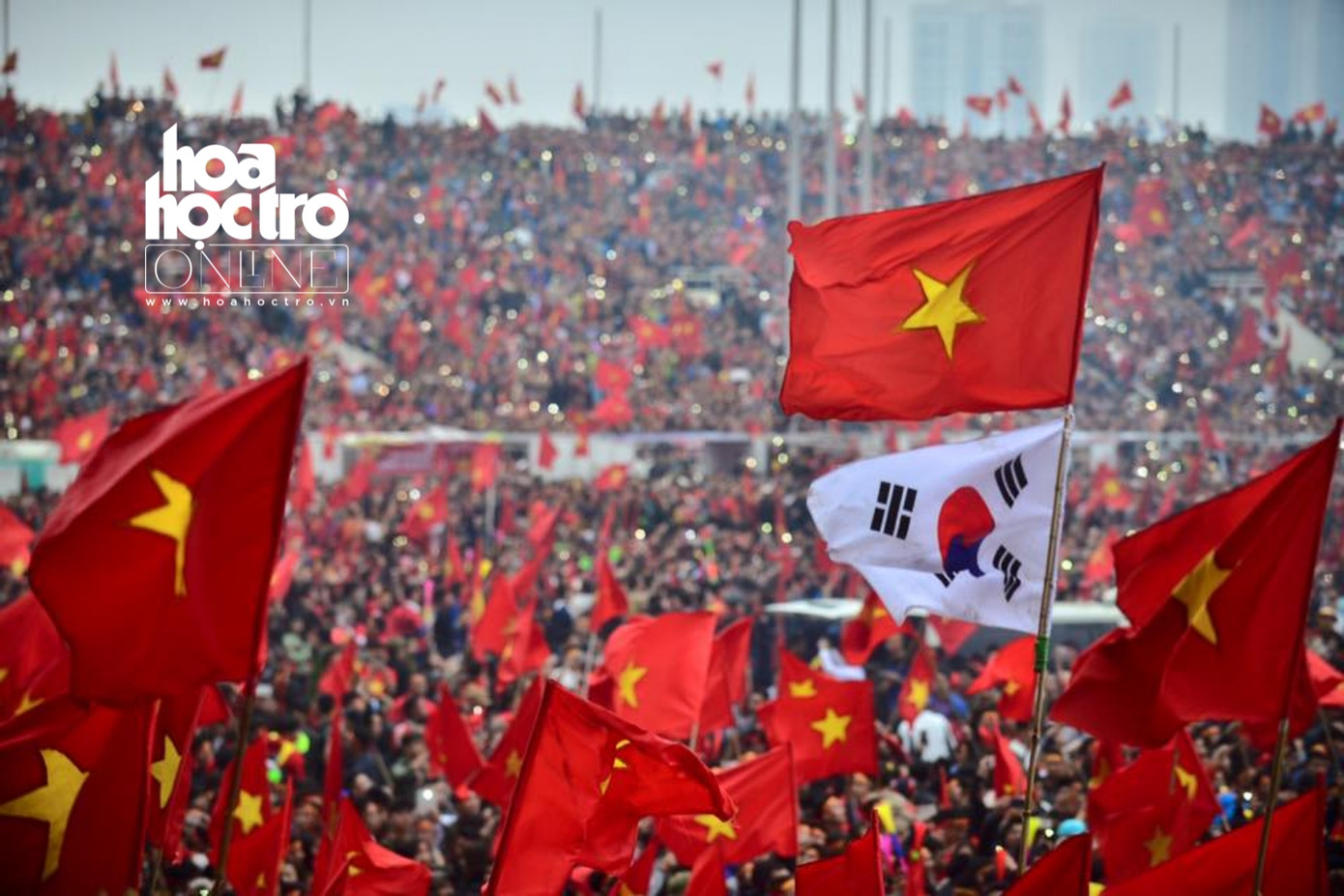 "Không thầy đố mày làm nên", đó là lý do vì sao lá cờ Tổ quốc của quê hương HLV Park Hang-seo xuất hiện trong "ngày vui đại thắng" tại Việt Nam. (Ảnh: Huy Phạm)