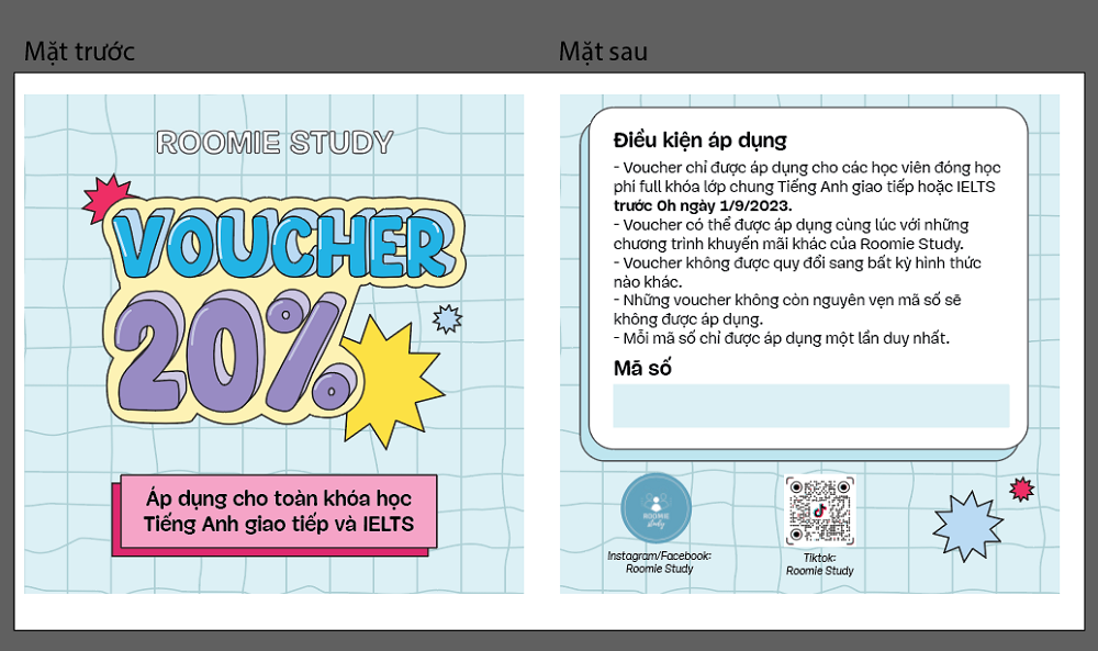 - Voucher giảm 20% toàn khóa tiếng Anh giao tiếp và IELTS của Roomie Study.