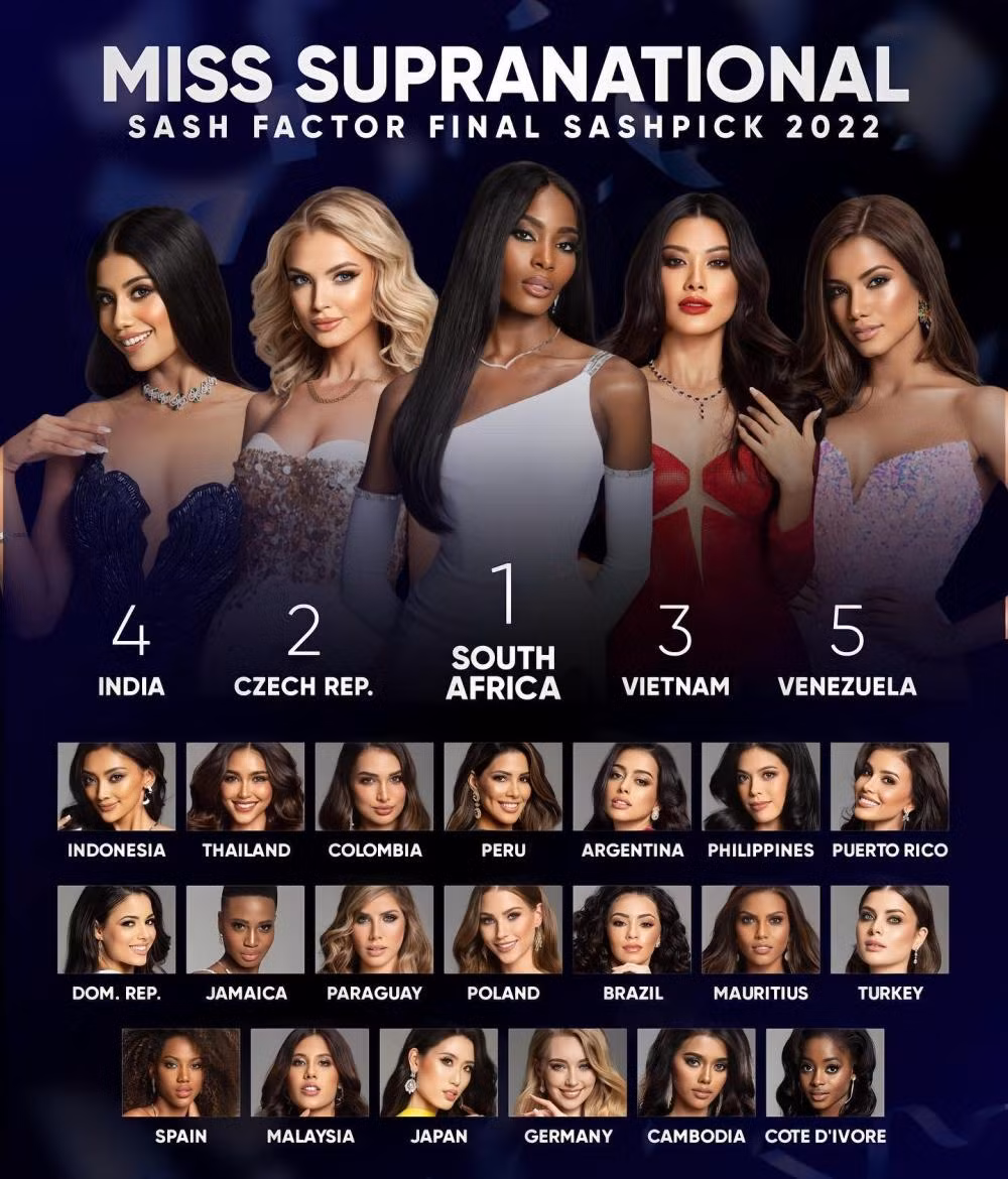 Chuyên trang Sash Factor trước đó cũng dự đoán Kim Duyên sẽ giành ngôi Á hậu 1, nhưng sau đêm Bán kết, Sash Factor cho rằng đại diện Việt Nam sẽ chỉ có thể giành Á hậu 2. Tuy vậy, đây cũng là một ví trí rất cao của cuộc thi. Chuyên trang này cho rằng đại diện Nam Phi, từng là đối thủ của Kim Duyên tại đấu trường Miss Universe 2021 sẽ giành vương miện.