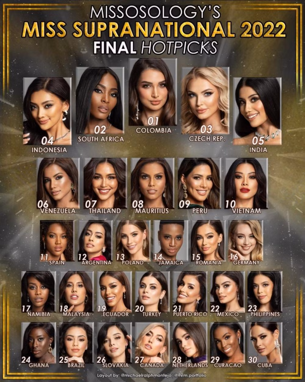 Missosology cho rằng Á hậu Kim Duyên chỉ có khả năng lọt Top ở vị trí thứ 10, chứ không phải vào tận Top 5 như dự đoán trước đó. Đại diện đến từ Venezuela từng được dự đoán giành ngôi Hoa hậu cũng tụt xuống vị trí thứ 6.