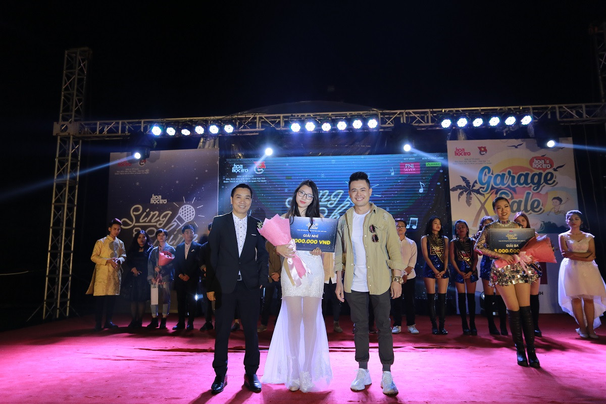 Giám khảo Trung Quân và giám khảo Tạ Quang Thắng trao giải Ba cho thí sinh Nguyễn Mai Anh.