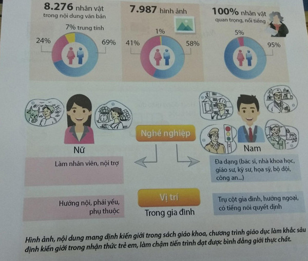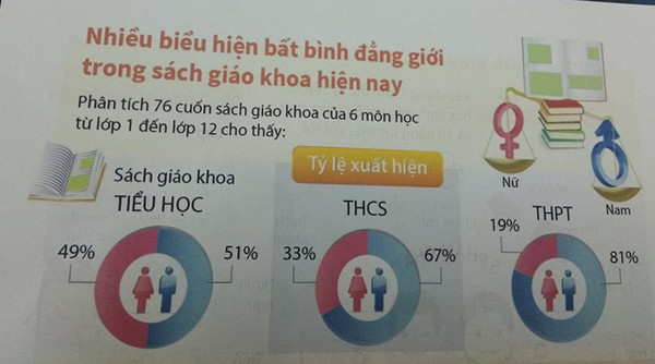 Cụ thể, phân tích 76 cuốn SGK của 6 môn học từ lớp 1 đến lớp 12 cho thấy, ở cấp THCS, tỉ lệ nữ xuất hiện chỉ 33%; Cấp THPT, tỉ lệ nữ chỉ 19%. Ở nhân vật xuất hiện trong văn bản, cấp tiểu học, chỉ có 24% là nữ và cấp THPT, các nhân vật nổi tiếng xuất hiện trong cấp học này chỉ chiếm 5%, còn lại là nam giới.