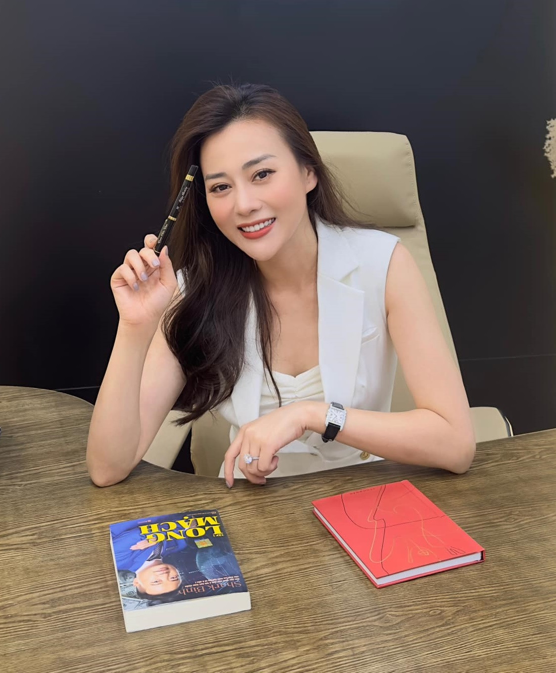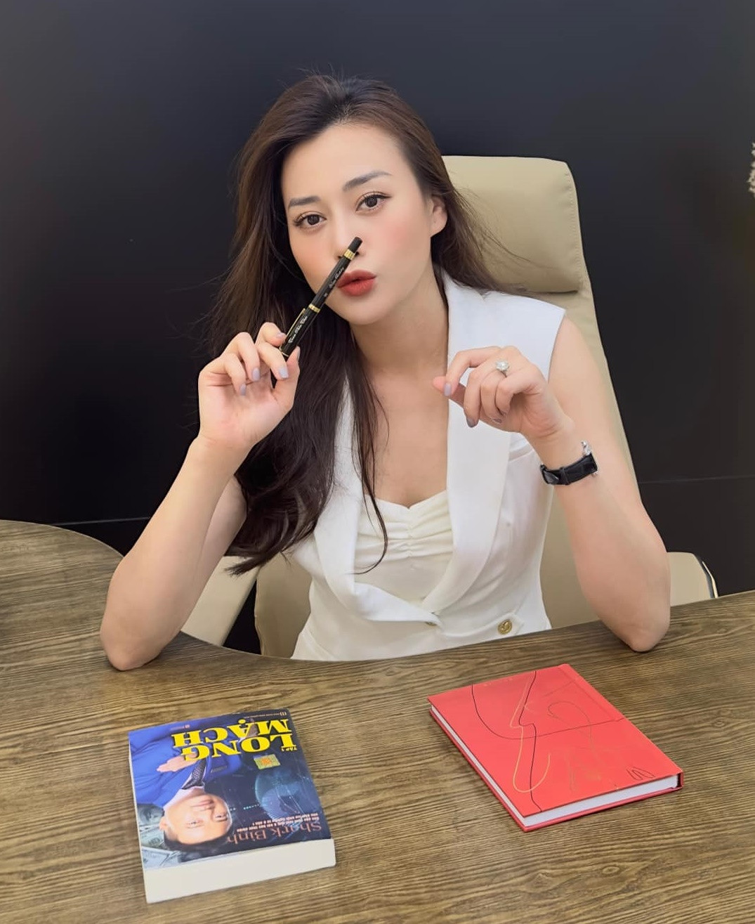 Mới đây, Phương Oanh lại khoe ảnh vào vai nữ tổng tài ở ngay trụ sở của thương hiệu thời trang do cô làm chủ. Ngoài chiếc nhẫn đính kim cương nổi bật trên bàn tay trái, netizen còn chú ý đến quyển sách đặt trên bàn làm việc.