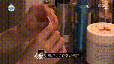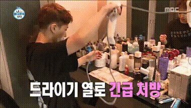 Khổ nỗi toner quá lạnh, Gikwang chịu không nổi nên lấy máy sấy ra hơ cho miếng bông ấm lên thì mới dùng được.