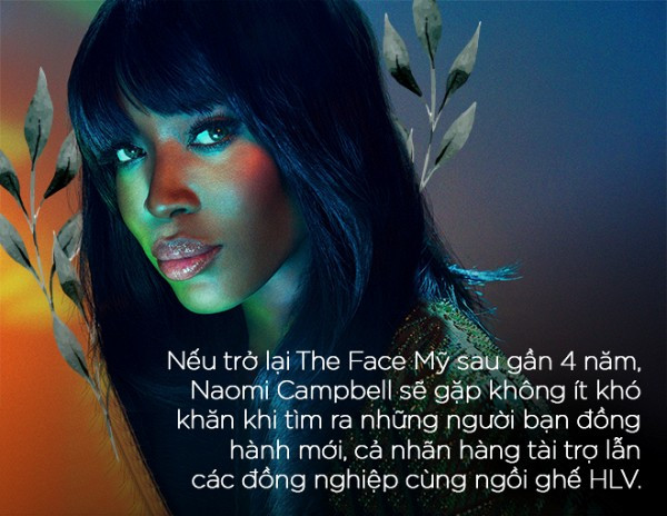Tất nhiên, Naomi Campbell luôn tự hào về thành công của các phiên bản The Face có sự góp mặt của mình. Chương trình thật sự có ý nghĩa đối với các thí sinh - các người mẫu nữ tiềm năng và mang về cho Naomi cả danh tiếng lẫn tiền của. Thế nhưng, khi có quá nhiều điều khiến “báo đen” phải… lo lắng thì không vận hành The Face, Naomi vẫn thừa sức “cá kiếm” và sống “sang chảnh”, thậm chí còn hơn hẳn thời gian vất vả với chương trình. Đây có lẽ cũng góp phần khiến Naomi ít tập trung hơn vào việc mang “đứa con cưng” trở lại.