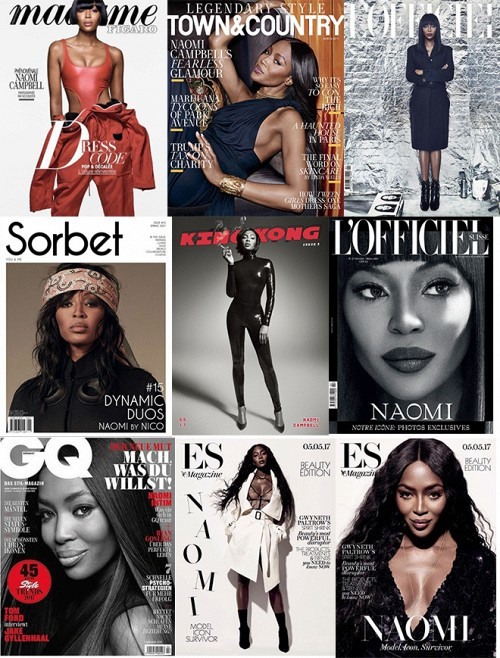 Đây chỉ là những cover mà Naomi “độc chiếm” trong năm 2017. Nếu tính cả quãng thời gian hậu The Face đến nay thì số lần Naomi lên bìa các tạp chí danh tiếng quả là không đếm xuể.
