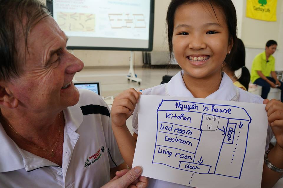 Chuyên gia cứu hộ người Úc Tony Coffey hướng dẫn bé gái vẽ sơ đồ thoát hiểm.