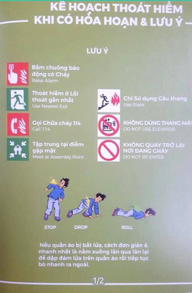 Chú ý: Hầu hết các nạn nhân đám cháy thường bất tỉnh trước khi gặp lửa vì NGẠT khói. Tư thế di chuyển trong lúc thoát hiểm là bò sát mặt sàn, vì khói độc sẽ bay lên cao, không gian an toàn nhất càng thấp càng tốt.