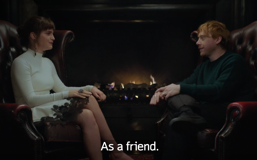 Vì đã đồng hành cùng nhau rất nhiều năm, từ ấu thơ cho đến lúc trưởng thành, cả Emma Watson lẫn Rupert Grint đều dành cho nhau những tình cảm gắn bó như người một nhà, dù có thể họ không gặp nhau thường xuyên. Trong cơn xúc động, Rupert đã nói: "Anh yêu em", và tỉnh táo bổ sung thêm "như bạn bè", khiến anh và cả Emma cười phá lên.