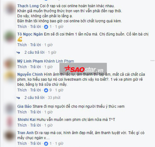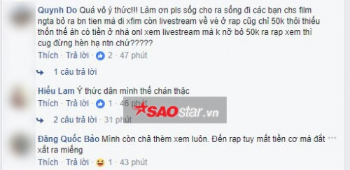 Bạn Nguyễn Chinh cho biết: “Một vé xem phim giờ rẻ bèo, bằng ly trà sữa chứ mấy”. Chính vì vậy, việc livestream, quay lén phim trong rạp là hành vi không thể chấp nhận được. Bạn Tran Anh bổ sung: “Đi ra rạp mà coi, hình ảnh đẹp mắt, âm thanh tuyệt vời, tiếc vì mấy chục ngàn?”.